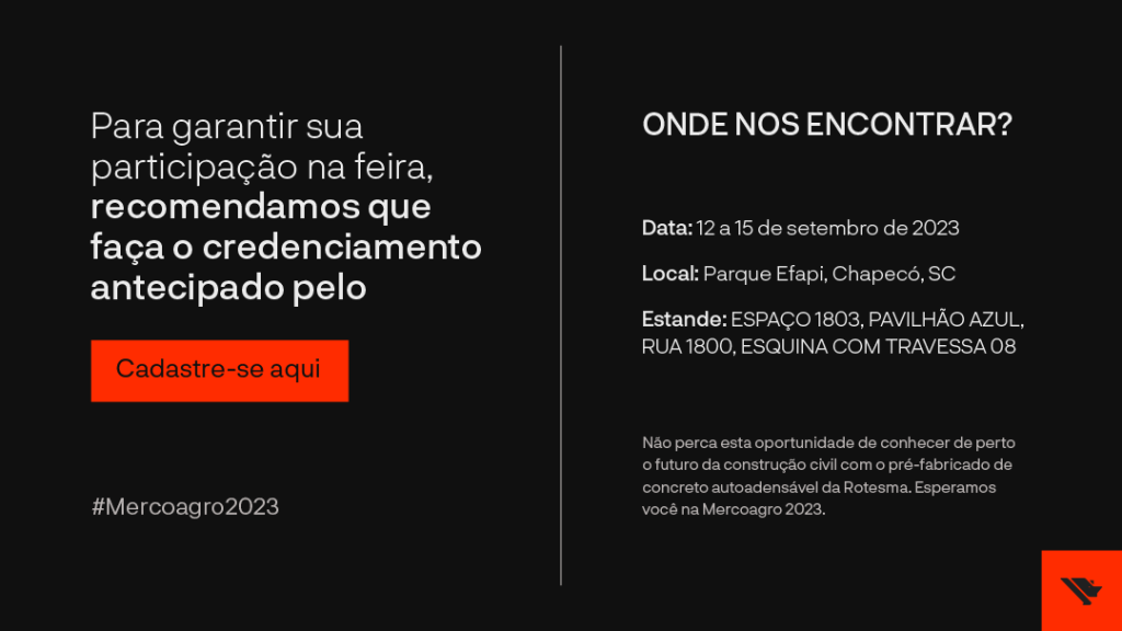 Convidamos você a visitar nosso estande na Mercoagro 2023 e conhecer mais sobre os nossos produtos. Será uma excelente oportunidade para trocar experiências, tirar dúvidas, e entender como o pré-fabricado de concreto autoadensável Rotesma pode ser um aliado essencial em suas futuras obras.